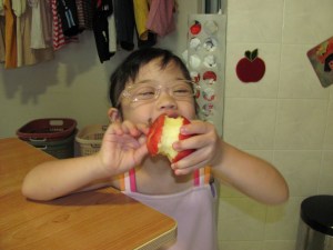 For the FIRST time, she kind of gnawed (I know I made her sound like a rabbit) around on a WHOLE apple ALL BY HERSELF and then told us, about 5 minutes later, “This is apple hamburger.” I’m not sure about hubby but I was EXTREMELY surprised. And it did look like a hamburger of sorts. I quickly grab my camera to take some photos.