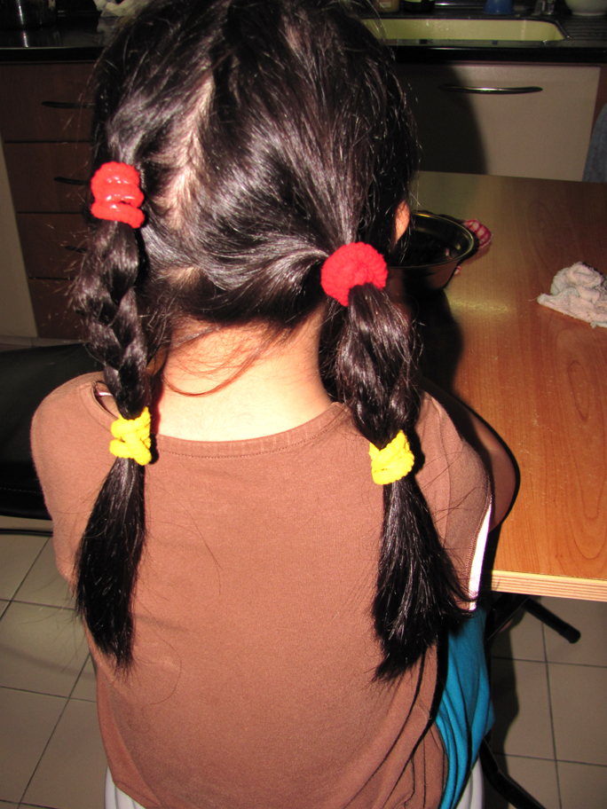 * One day at dinnertime, I told CM to help me tie up LA’s hair so it won’t get into her food. Rebecca had tied LA’s hair into 2 plaits earlier on but it got messy. So dear papa decided to try his hands at tying plaits for LA. That’s so sweet of him. It’s such a privilege to have her hair done by the head of our household. LA was very proud of her plaits 🙂 Check it out here:
