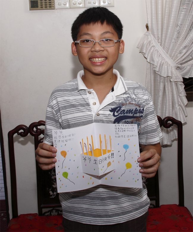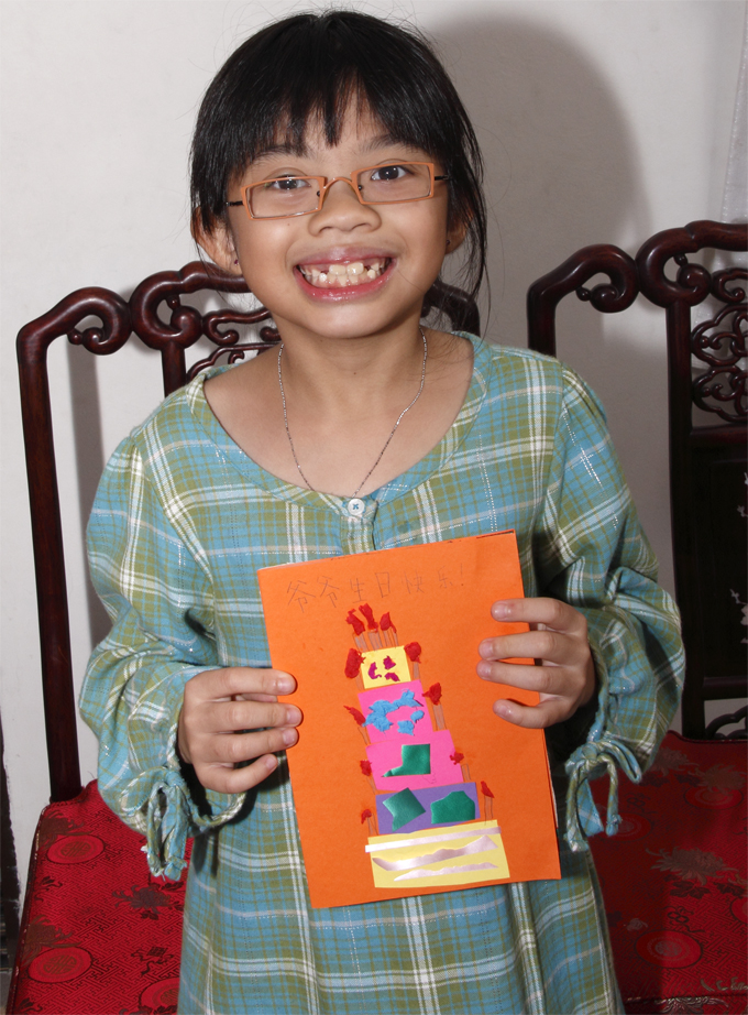 * We also celebrated my father-in-law’s 81st birthday in August. It was a wonderful time for the whole family as many relatives came from overseas to join in this celebration. I was grateful to get to know many of these relatives again as we rarely met, let alone keep in touch. In addition, we took this opportunity to teach our children more about the extended family. The children made birthday cards for their grandfather,爷爷。 It was an excellent opportunity for some occupational therapy with Li-Ann as we rolled balls of crepe paper and stuck ribbons. Although her body and fingers were tired, she kept going with my help and promptings.
