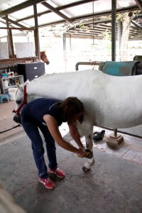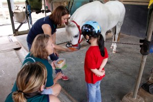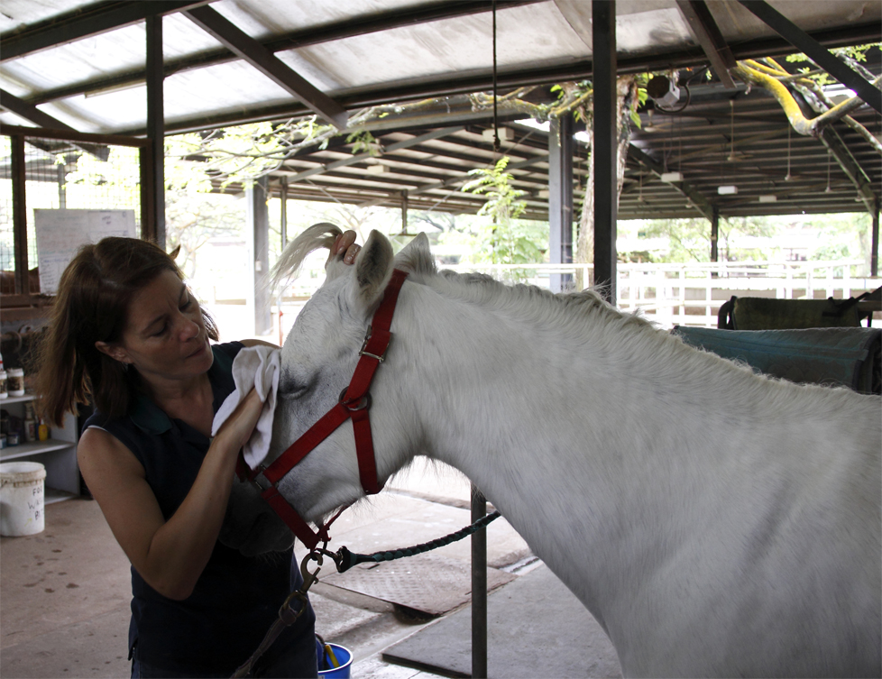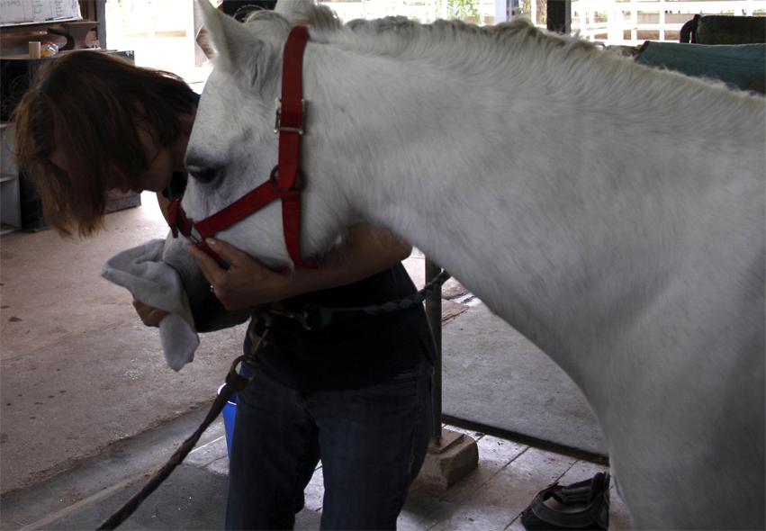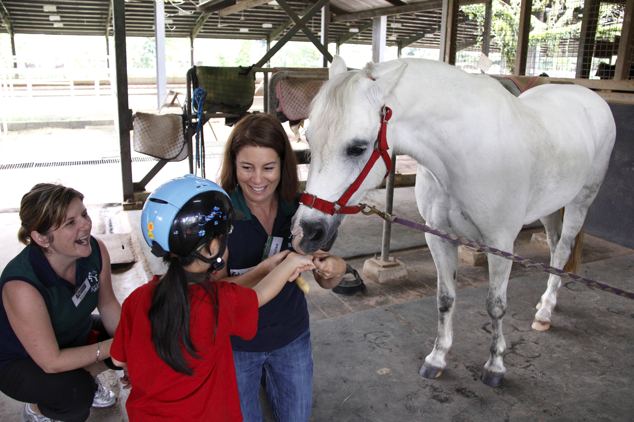 One day, LA asked me why Glow can’t kiss her. I urged her to ask Louise but she didn’t. I told one of the side walkers who then asked Louise. Louise told me the closest one can get to receive a kiss from a horse (other than a messy and wet one on the cheek) was to allow the horse to take a small piece of apple/carrot from one’s hand. And I would be able to take photos of LA feeding Glow too! How nice was that? So we went to buy apples and carrots and I even got LA to help to cut some apples. Our problem that morning was – Daddy forgot we had to go to RDA and drove the car to office! I tried frantically to flag down a cab but we didn’t get into one until about half an hour later. LA was disappointed to have missed her riding lesson that morning but we still went as LA was expecting to feed Glow. It was exciting to get really close to Glow. Louise showed us how she usually cleans Glow up. LA was eager too. But when she felt Glow’s wet tongue, she decided she had enough trying to feed Glow. Well…at least she got an answer to her question. Meanwhile, I had my share of fun 🙂