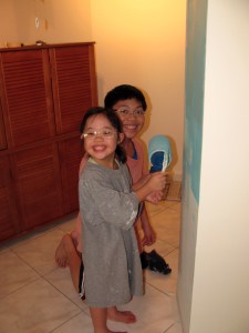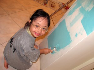 * We ended the year with a PIP – Papa Initiated Project – painting the living and dining room. In fact, it was more than painting, it was a spring cleaning-cum-painting project. As we shifted the things around, we also threw away unwanted stuff, reorganised whatever’s left and vacuumed up the thick dust hidden behind the TV console, book shelves and paintings etc. The children were excellent help as they painted and helped with the cleaning up. Even little LA didn’t want to be left out. I made sure the hardworking ‘workers’ had food and water as they worked while helping to touch up now and then. Yes, our backs ached and our hands became stiff but we were extremely satisfied with the clean walls and the new design. Most of all, we were very proud that we did it TOGETHER as a family! Here are some work-in-progress shots…