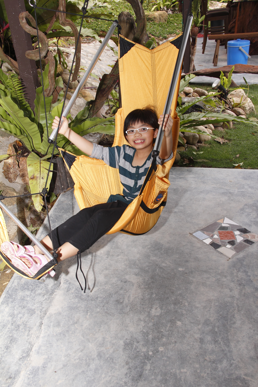 The reception area was cozy, nicely decorated and sculptured with a mix of furniture for the different personalities; they were carrying out improvement works when we were there. It doubled up as a place for supper at night. We also spotted two cats that would hang out then. This inspired Rebecca to write 2 Kittens. There was usually music playing – to suit the day and night. We particularly liked this swing (yellow colour) near the slope – although there were 3 of them; it was really enjoyable to sit in and swing around. We would all fight to sit in it.