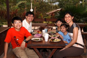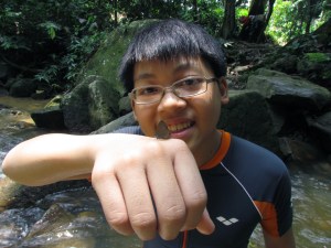 We began our night walk after dinner and we had 2 Malay guides with us. They were locals and were very familiar with the area. With a mixture of excitement and apprehension and a few relatively powerful torch lights, we ventured forth – our first adventure in the dark, not certain what to expect. We began our ‘exploration’ as soon as we stepped out of the resort. After walking for some distance, we reached the palm oil plantation. We heard many sounds, saw some fireflies, interesting insects and spiders, marvelled at fungi that glowed in the dark and even spotted a few small durian plants. Li-Ann was afraid of the dark and we had to take turns to carry her. It was on our way back that she was more warmed up and motivated, especially after she spotted a few insects herself. She continued to shine her torch for us as we proceeded back to the resort for supper and shower.
