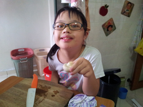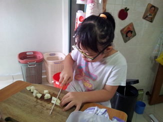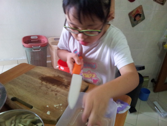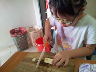 Li-Ann was eager to chip in when she saw what her older siblings were doing. Previously, she would chip in with a butter or paring knife. Recently, I ‘graduated’ her to a bigger and lighter ceramic knife. It is easier to cut as the knife is sharper. Of course, I am within reach of her and I watch her every move like a hawk. I will remind her to look out for her fingers and to keep her knife blade straight. While she may not cut as fast or she can’t last as long, she learns quickly, she is very diligent and would try her best. I usually give her short breaks now and then. Li-Ann will need more practice. But it is her willingness that will move her forward. YEA!!