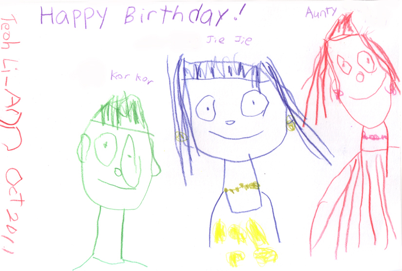 My niece turned 21 this month and I got LA to draw her a card. I directed her on how to draw and encouraged her to use different colours. She seems to be able to follow instructions and draw better now. Even her happy smiles are happy 🙂