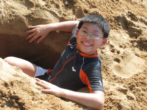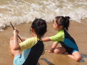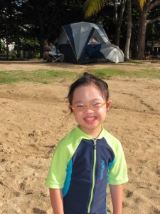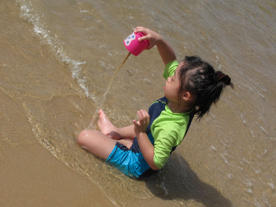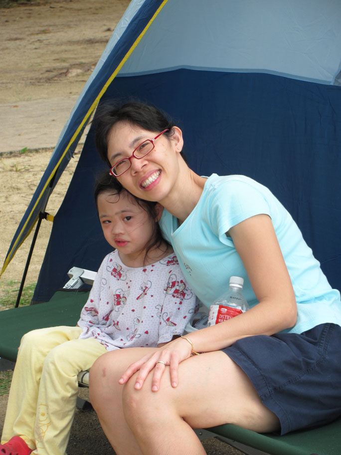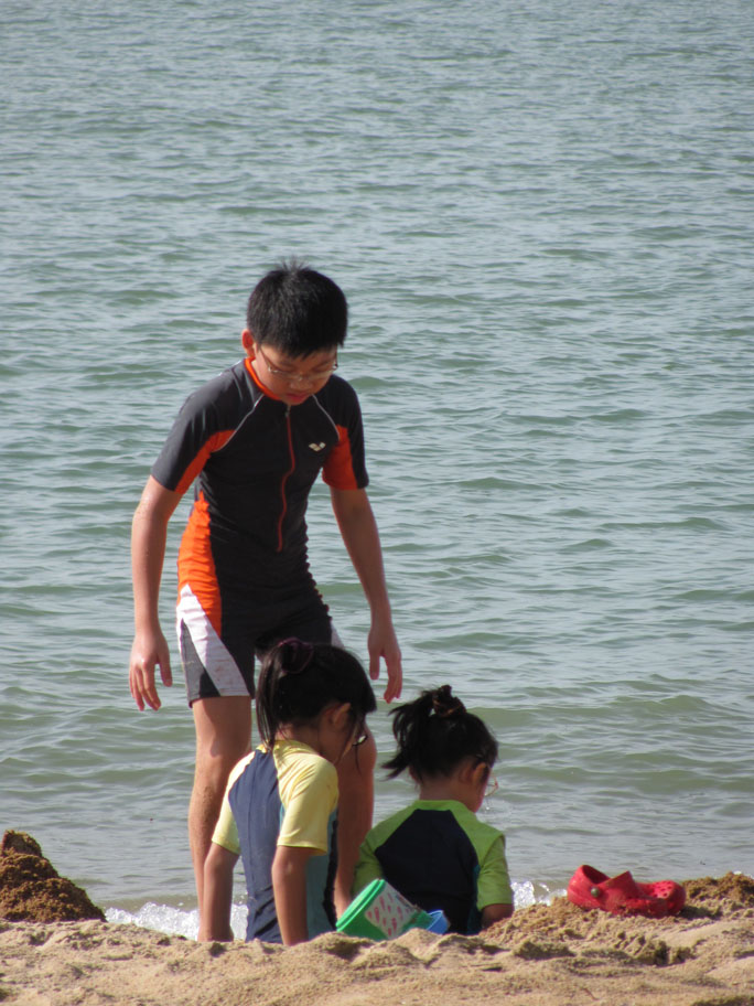 It was amazing how clearly Li-Ann remembered 90% of what she did and how she felt when we went camping in early October. She really enjoyed herself tremendously playing sand in the sun despite the fact that we rarely go to the beach. Being Mommy, I feared her skin getting burnt when the sun was burning hot at mid morning. Not knowing how careful she would be near the water, I repeatedly reminded her not to go too far out. But this audacious and cautious girl just inched herself closer to the waters and played some more there, totally comfortable and contented. Of course, she didn’t want to leave when we had to go. Neither did her Jie Jie and Kor Kor.