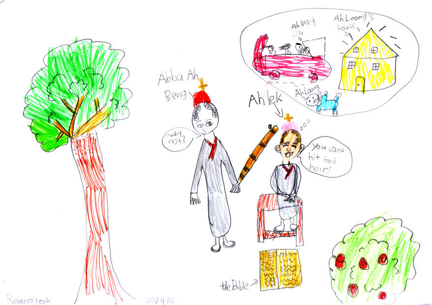‘Ah Lek Inherits Heaven and Earth’ is very amusing because he was daydreaming and he almost fell off the stool he sat on. ‘Walking on Water’ is also very enjoyable because Ah Lek and Ah Kow tried to copy Abba Isaac and wanted to walk on water like him. But Abba Isaac didn’t really walk on water. He was just walking to shore in shallow water. So it looked like he was walking on water. Many other stories are nice too, like ‘Durian Theology’ and ‘The Ban’.